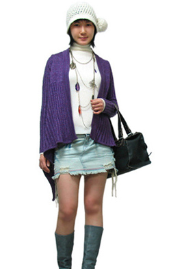 牛仔迷你(nǐ)短裙,搭配同色系皮靴,整體搭配很協調,灰藍色的(de)皮靴更是個(gè)性時尚。
