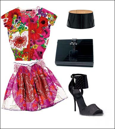 上(shàng)下身同樣以黑(hēi)色爲底色,同樣都(dōu)有(yǒu)紅色花朵相(xiàng)呼應,這樣再複雜的(de)圖案都(dōu)可(kě)以和(hé)諧地(dì)搭配在一起,帶來很強的(de)視覺沖擊。