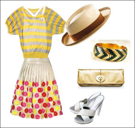 灰色黃(huáng)色條紋衫搭配棕色印花裙,腰部留出一些留白,顯得更加清爽,搭配草(cǎo)帽和(hé)涼鞋,完美(měi)而簡約的(de)美(měi)式度假風格。