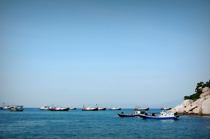 碼頭附近停泊的(de)漁船(chuán),藍藍的(de)天空,藍藍的(de)海(hǎi)水(shuǐ),水(shuǐ)天一色就是這麽來的(de)。